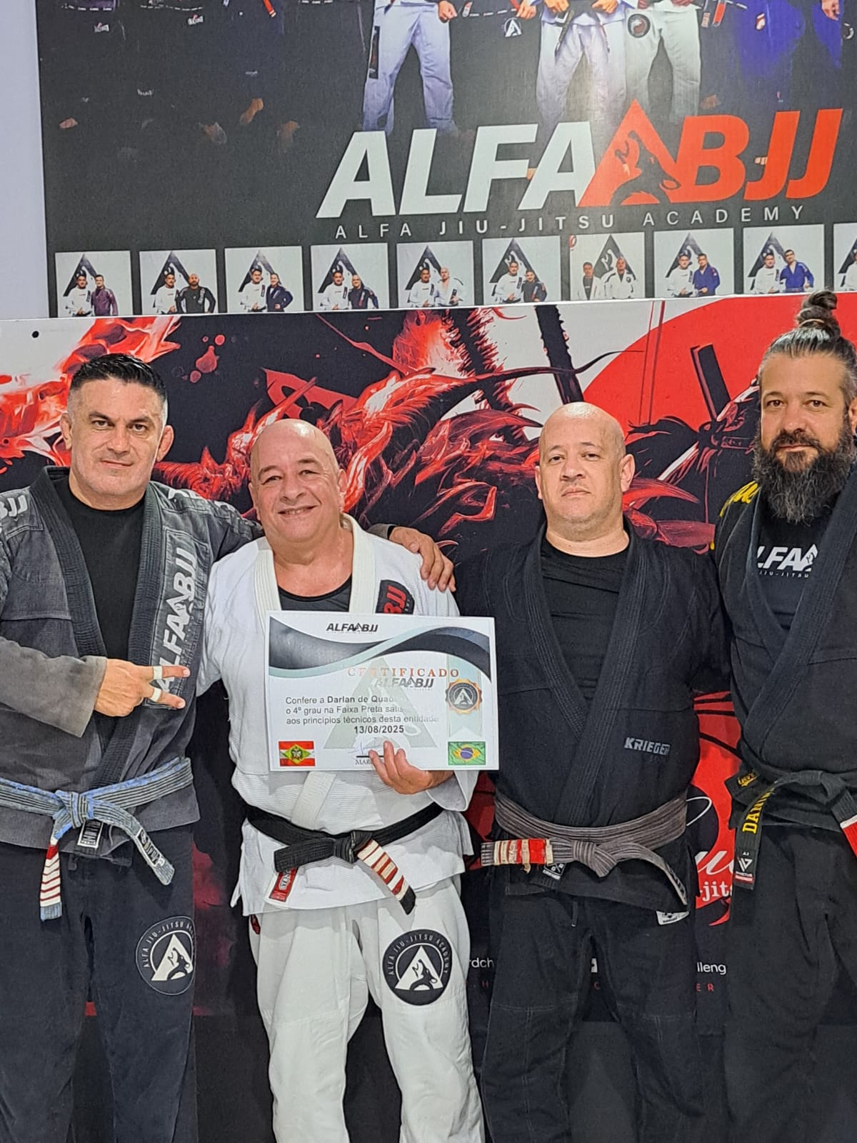 No dia 19 de setembro de 2025, o professor Darlan de Quadros alcançou mais uma importante conquista em sua trajetória no Jiu-Jitsu. Em uma cerimônia realizada na academia Alfa Jiu-Jitsu em Araranguá-SC, recebeu das mãos do líder da equipe, Marcos Giusti, o 4º grau em sua faixa-preta, reconhecimento de anos de dedicação, disciplina e compromisso com a arte suave.